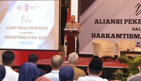 Kapolda Kalsel Irjen Pol Rosyanto Yudha Hermawan saat memberikan sambutan dalam Diskusi Aliansi Pekerja Buruh Banua terkait Harkamtibmas di Banjarmasin, Selasa (14/10/2025).
